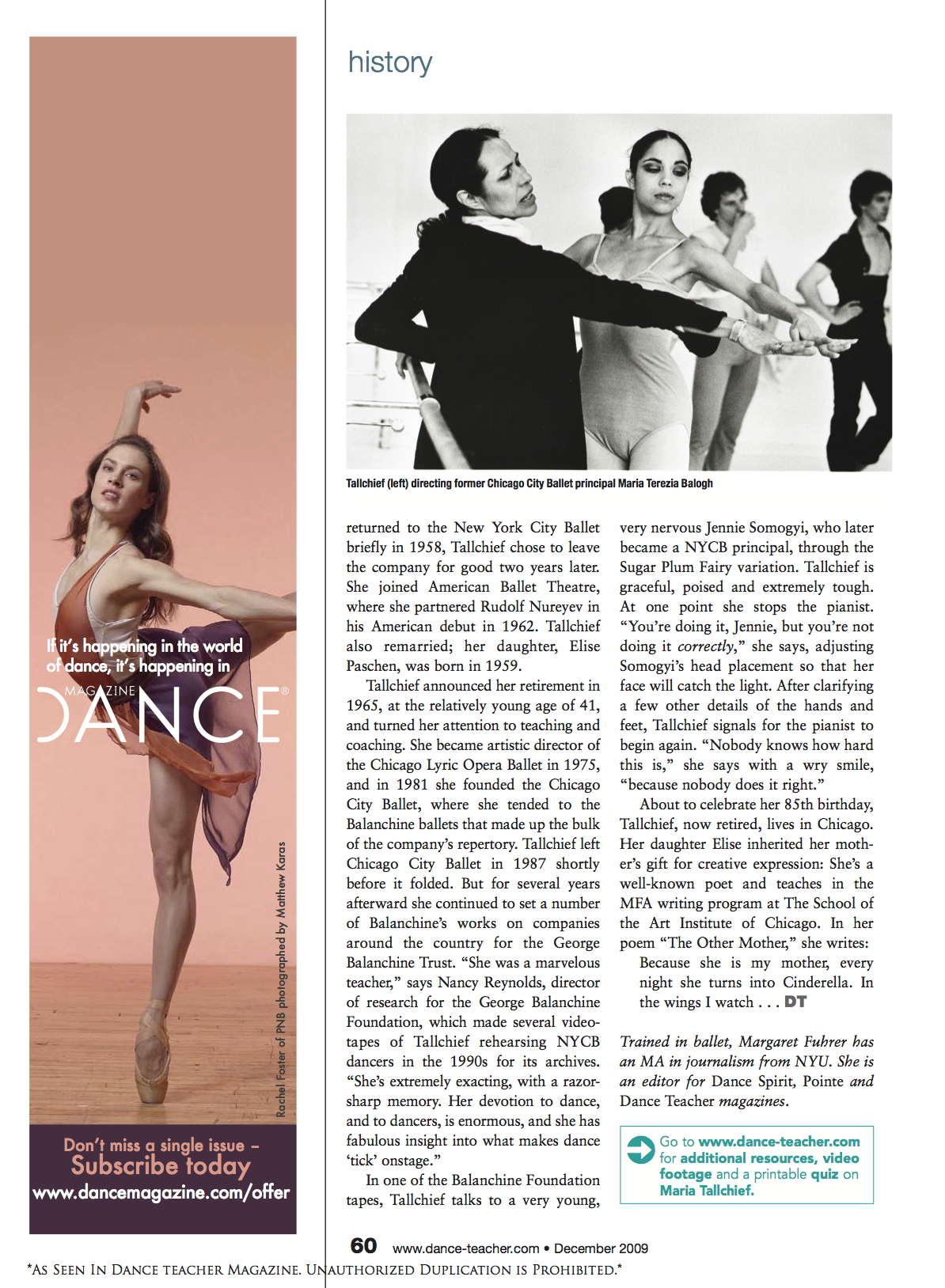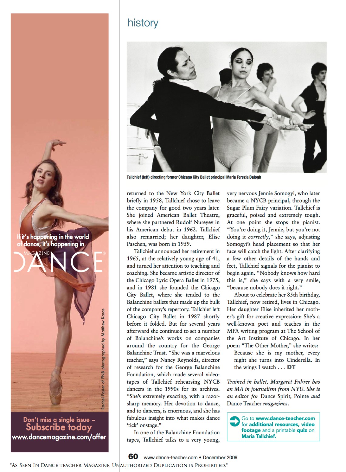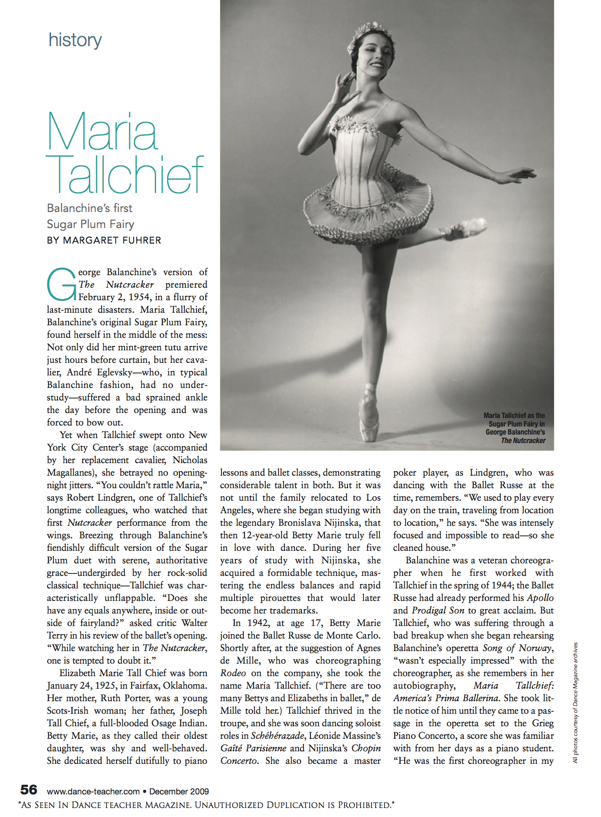 Maria Tallchief Margaret FuhrerDecember 1, 2009June 17, 2012Dance Teacher, Favorites, Profiles Post navigation PreviousNext Share this: Click to share on X (Opens in new window) X Click to share on Facebook (Opens in new window) Facebook Like Loading... Related